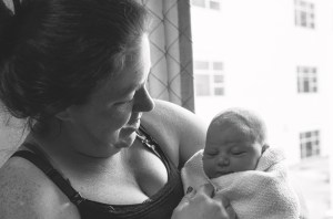 Baby V & mom by window III B&W